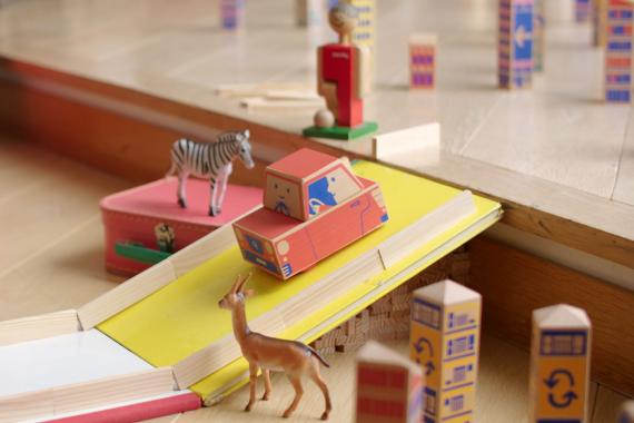 Cody est une petite voiture robotisée qui avance toute seule créée par QUBS. Elle change de direction lorsqu'elle détecte des commandes alors qu'elle s'approche des blocs qui représentent des édifices.